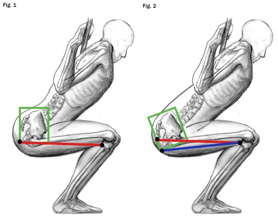 Having trouble maintaining your lumbar curve? When preparing to descend in the squat, make the chest big, abdomen tight, and flex the front hip down. The left picture shows how proper hip position promotes stronger performance.